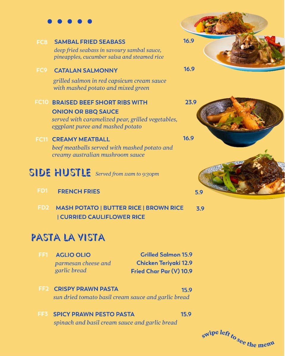 - Main Courses: Dishes such as Beef Stroganoff, Fish and Chips, Grilled Salmon Aglio Olio, Lemongrass Chicken, and Braised Espresso Beef Short Ribs provide varied protein choices.