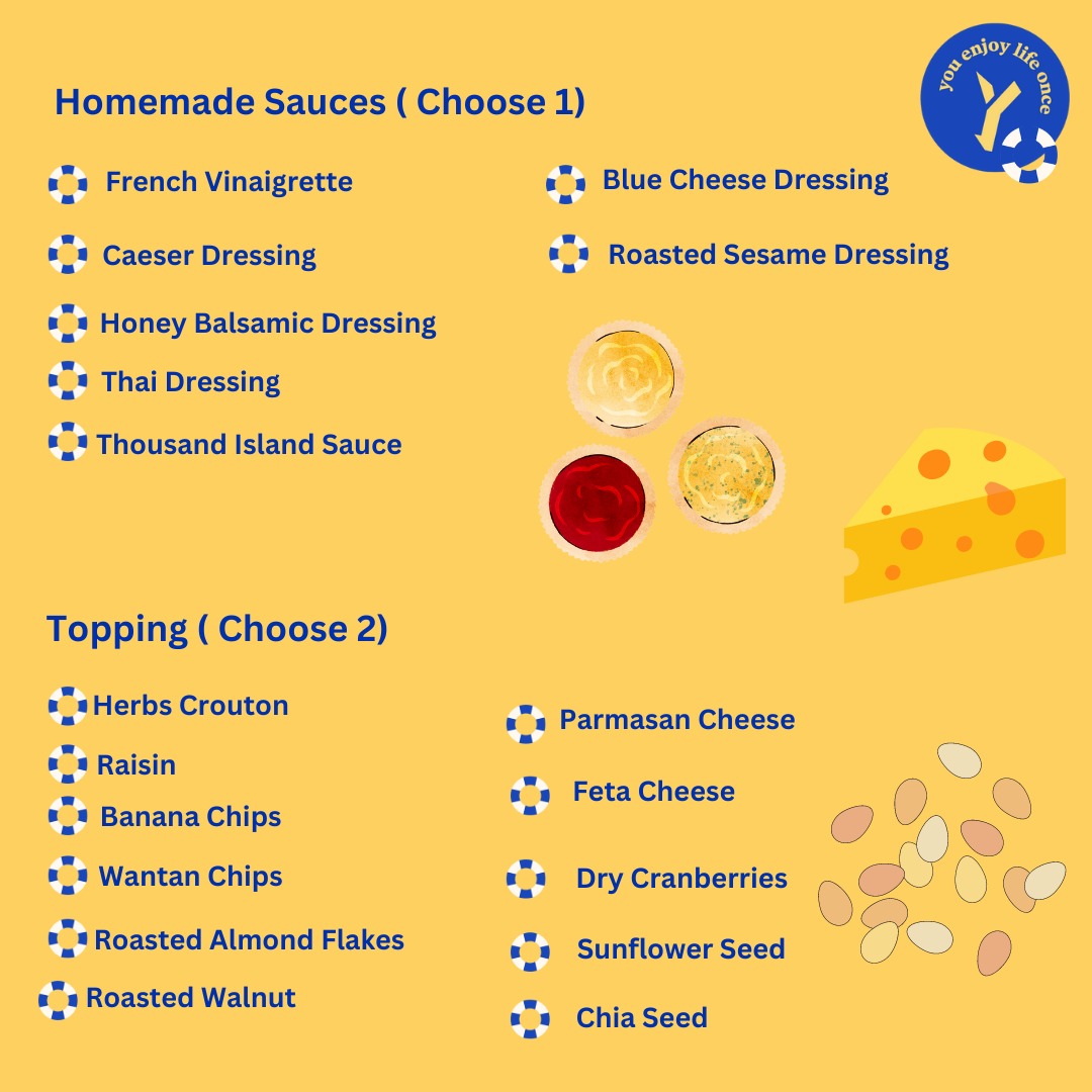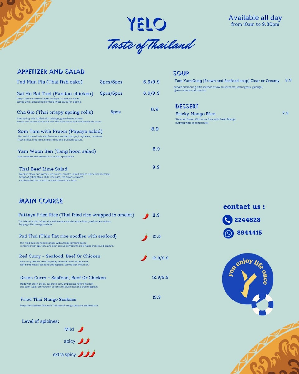 The menu at YELO Café Brunei features a selection of Western and Asian fusion dishes suitable for breakfast, casual dining, and light meals throughout the day. The offerings include a range of main courses such as grilled seafood, beef dishes, and noodle preparations. Several options highlight international flavors, including Balinese cuisine, Thai-inspired salads, and pasta dishes.